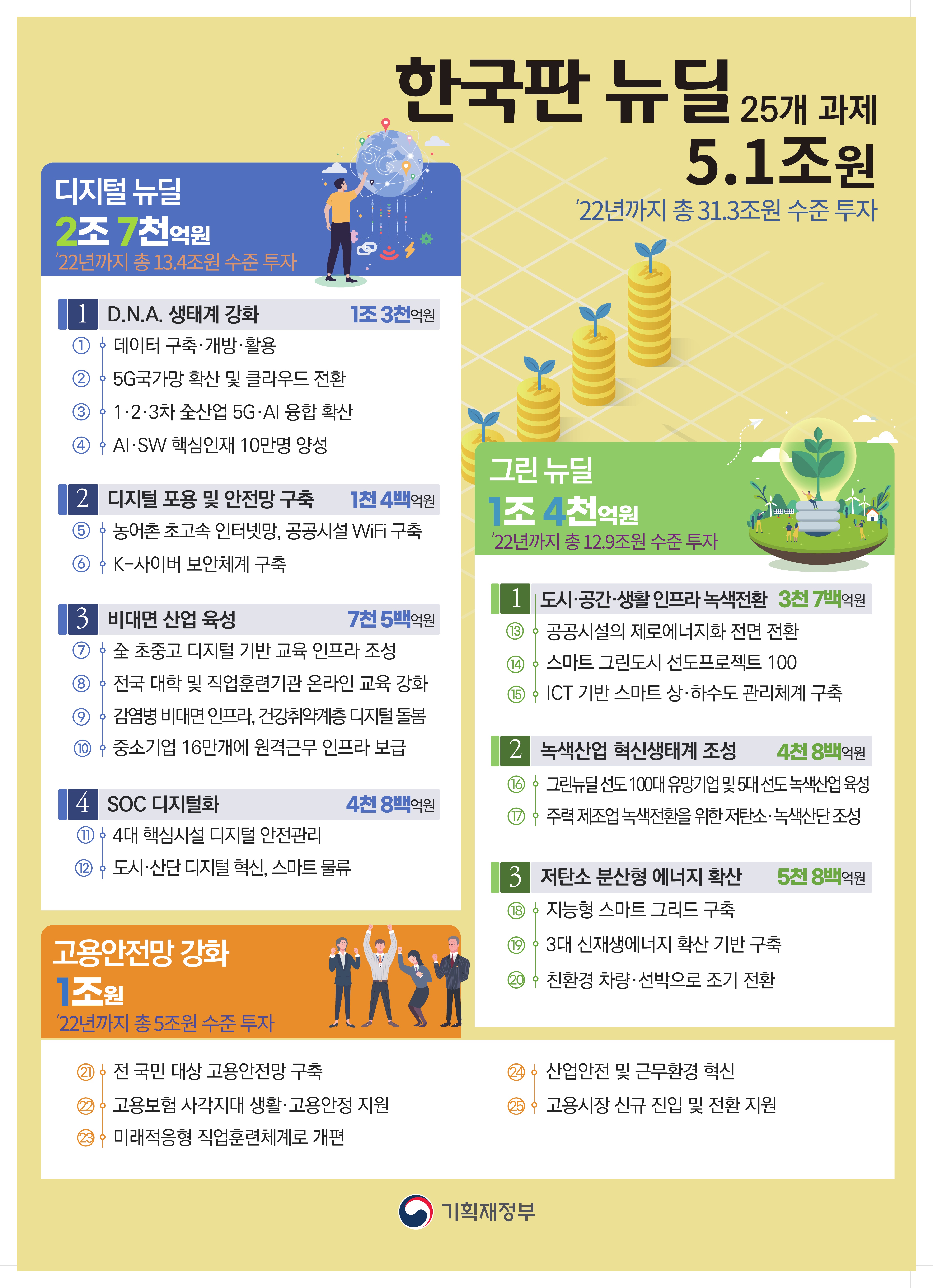 그리고 한국판 뉴딜과 관련된 주요 내용입니다. 앞서 말씀드린 바와 같이 5.1조 원의 규모로 그림을 그리고 있습니다. 총 25개 과제를 계획하고 있습니다. 관련 분야의 고용창출, 투자 활성화, 창업 등 대부분의 연결고리가 이어질 것입니다. 많은 관심이 필요합니다.