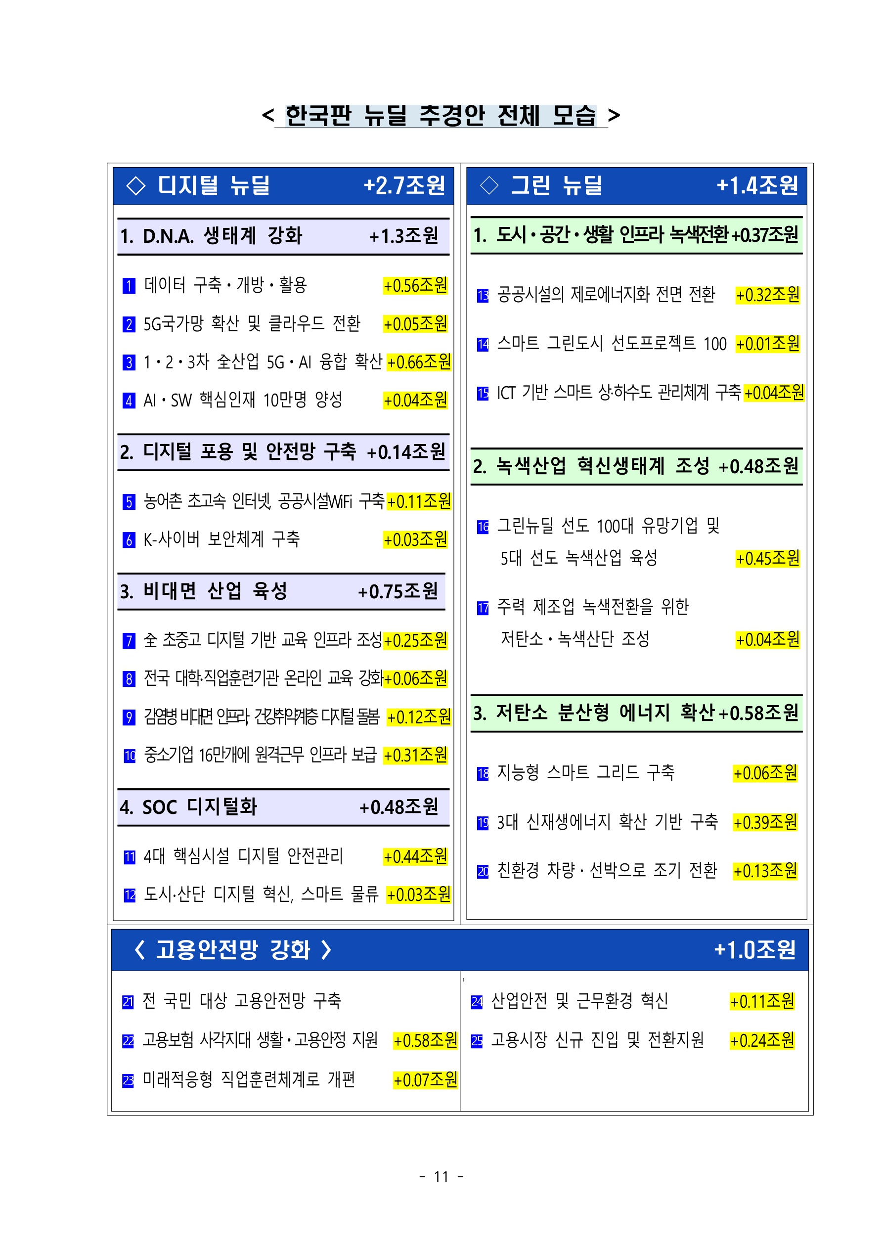 디지털 뉴딜에 2조 7천억 원, 그린 뉴딜에 1조 4천억 원, 고용망안전 강화에 1조 원의 세부계획을 가지고 있습니다. 사업을 하는 사람 직장인, 예비 직장인들 모두를 망라하는 사업이므로 대한민국 성인이라면 한국판 뉴딜사업에 관심을 가질 필요가 있겠습니다. 대부분의 대한민국 성인들에게 해당되는 내용입니다.