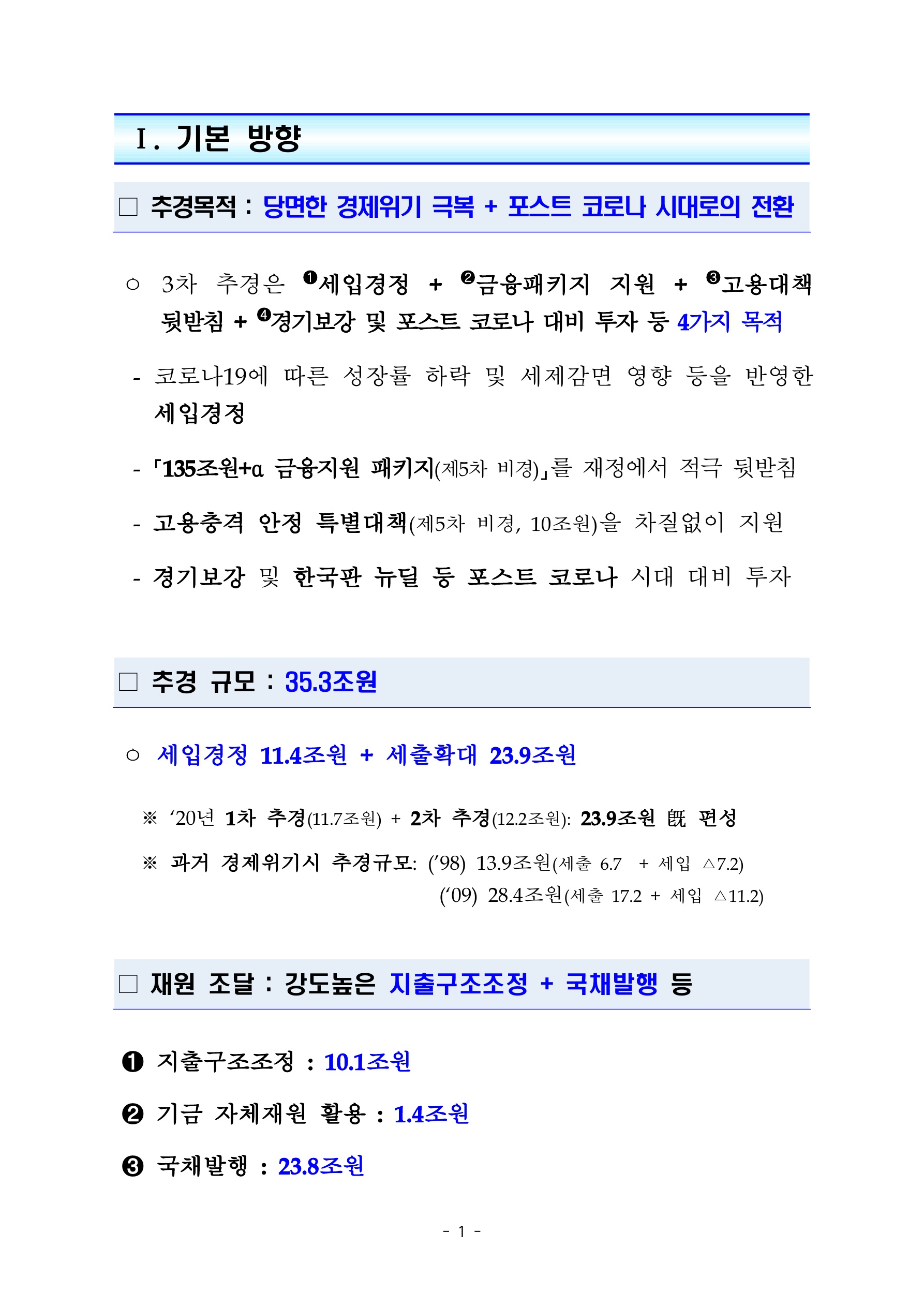 아래는 기본 방향입니다. 추경 목적이 나타나 있습니다. 작금의 전염병 사태로 인한 당면한 경제위기를 극복하고자 함이 주요 목적이라고 공표했습니다. 추경 규모는 35.3조 원입니다.