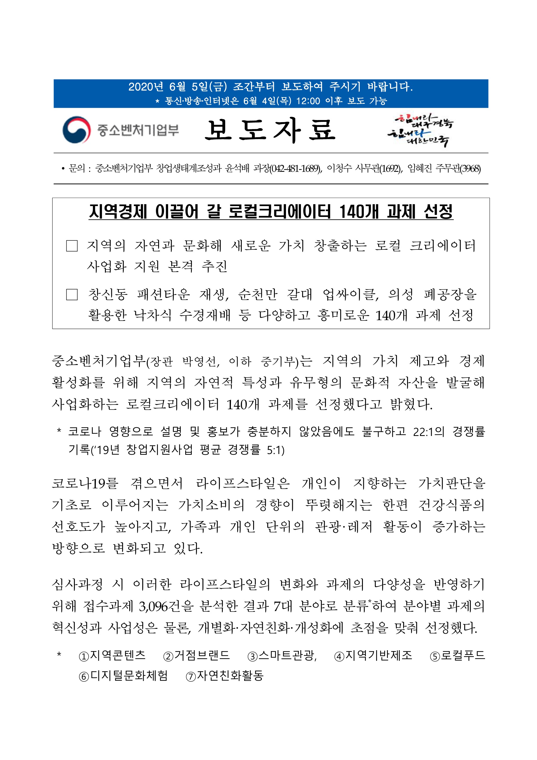 아래 보시면 지역 경제를 이끌어 갈 로컬 크리에이터 140개 과제를 선정했다는 중소벤처기업부의 공문이 있습니다. 아래 보여드릴 자료의 출처는 중소벤처기업부입니다.