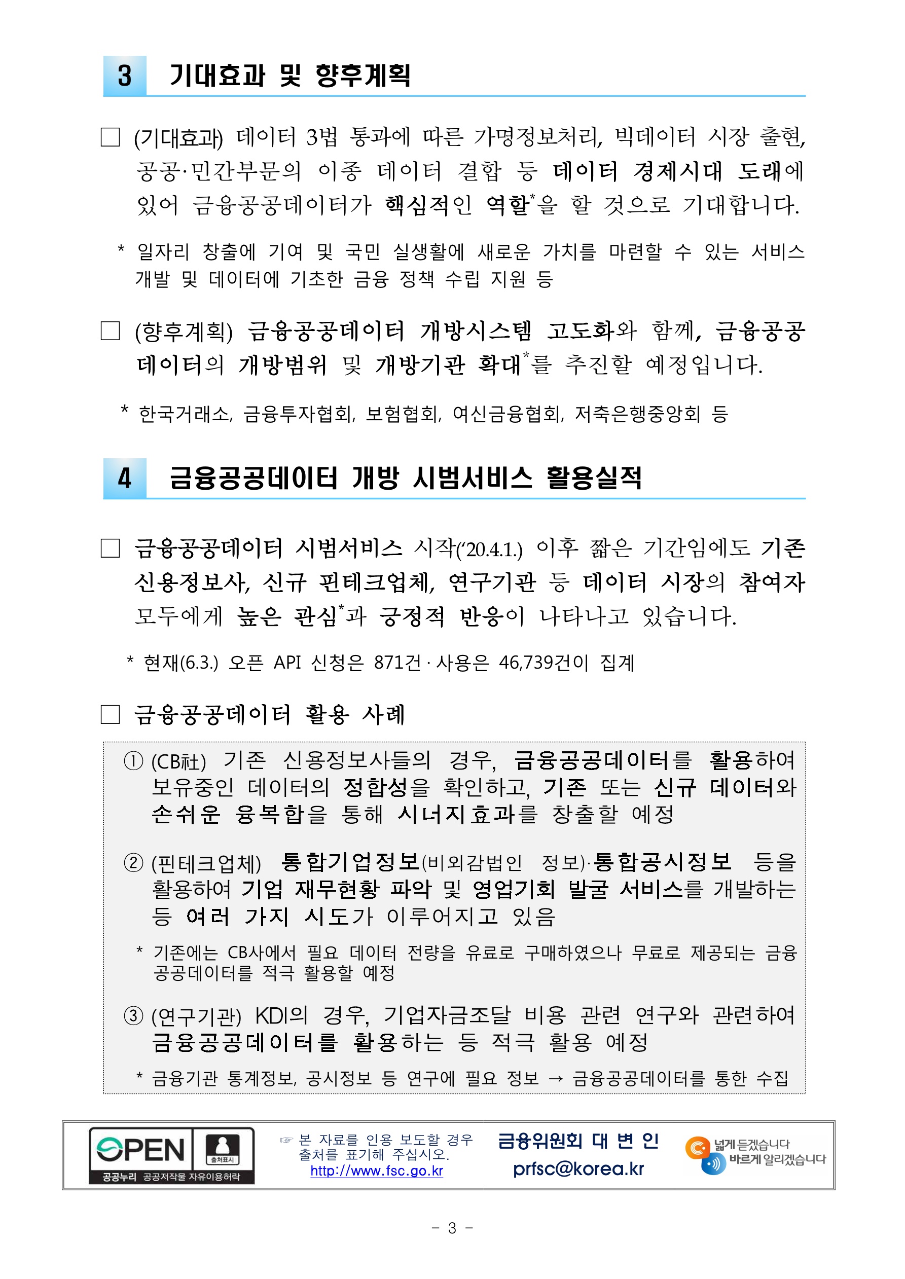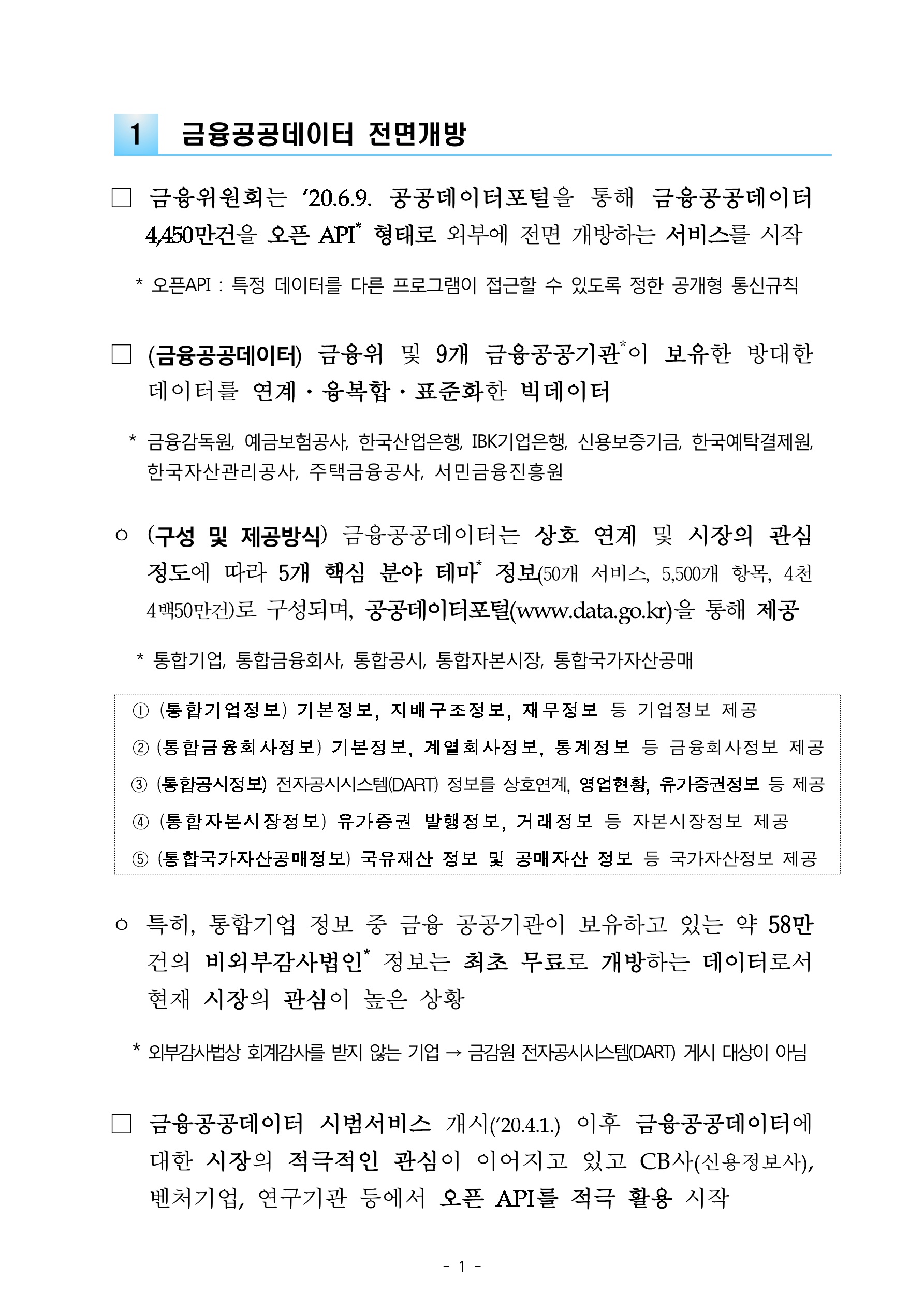 아래 금융위원회에서 공개한 관련 문서입니다. 금융 공공데이터 전면 개방한다는 내용의 문서입니다.