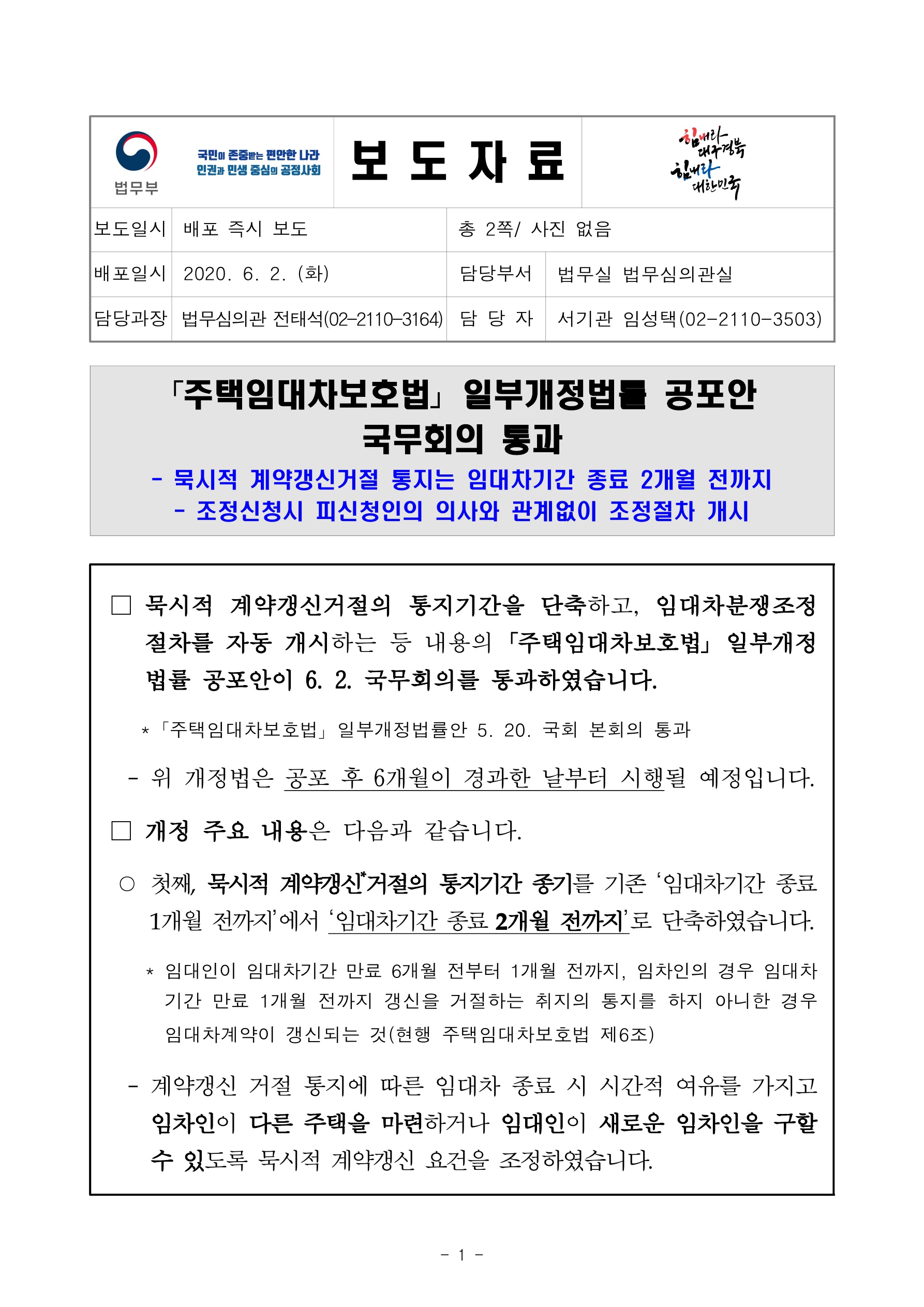 주택임대차 보호법 일부가 개정되어 관련 공포안이 국무회의를 통과했다는 내용입니다. 내용의 주요 줄기는 묵시적 계약갱신거절 관련입니다. 임대인과 임차인의 이해관계가 첨예하다 보니 개정, 보강된 내용의 법률입니다. 아래 내용과 같습니다.
