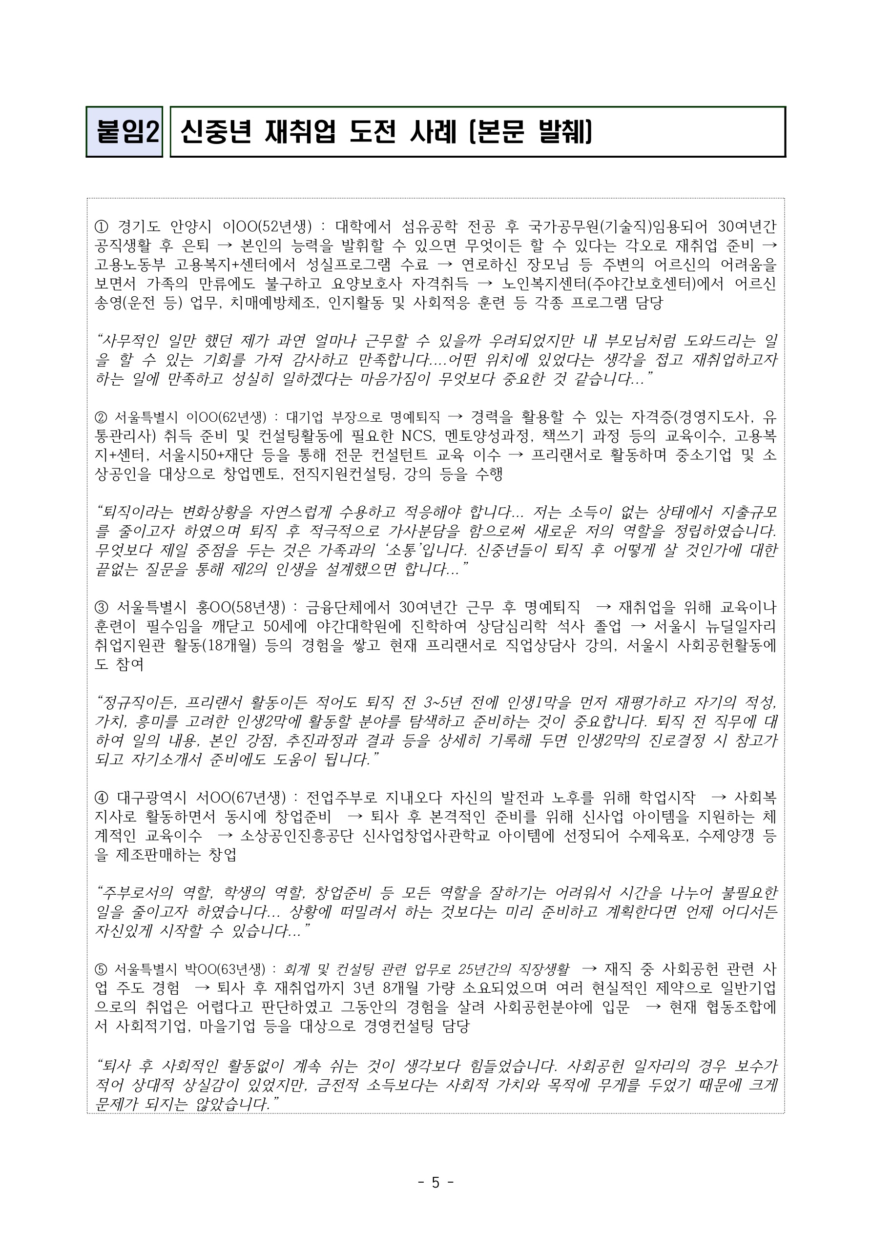 아래는 신중년 재취업 도전 사례입니다. 본문에서 발췌한 내용입니다.