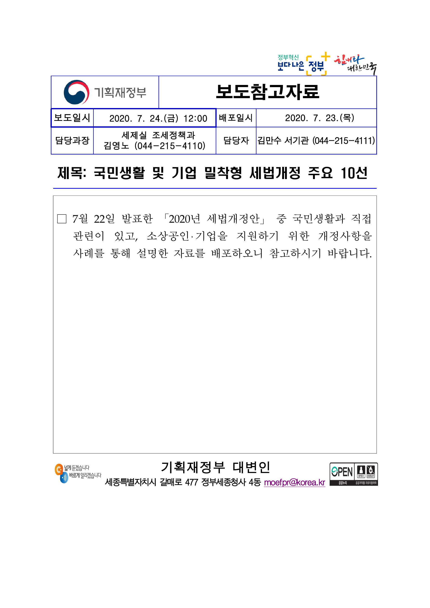이러한 상황에서 정부 (기획재정부)에서는 아래 보시는 국민생활 및 기업 밀착형 세법개정 주요 10선이라는 제목의 보도자료를 생산했습니다. 즉 아래의 자료는 기획재정부 출처의 자료입니다. 아래 보도자료 중에서 중요한 내용을 리뷰하고자 하오니 잘 보시고 돈을 방어하는데 도움되는 생생한 정보 많이 얻어가셨으면 좋겠습니다. 아래 내용으로 시작합니다.