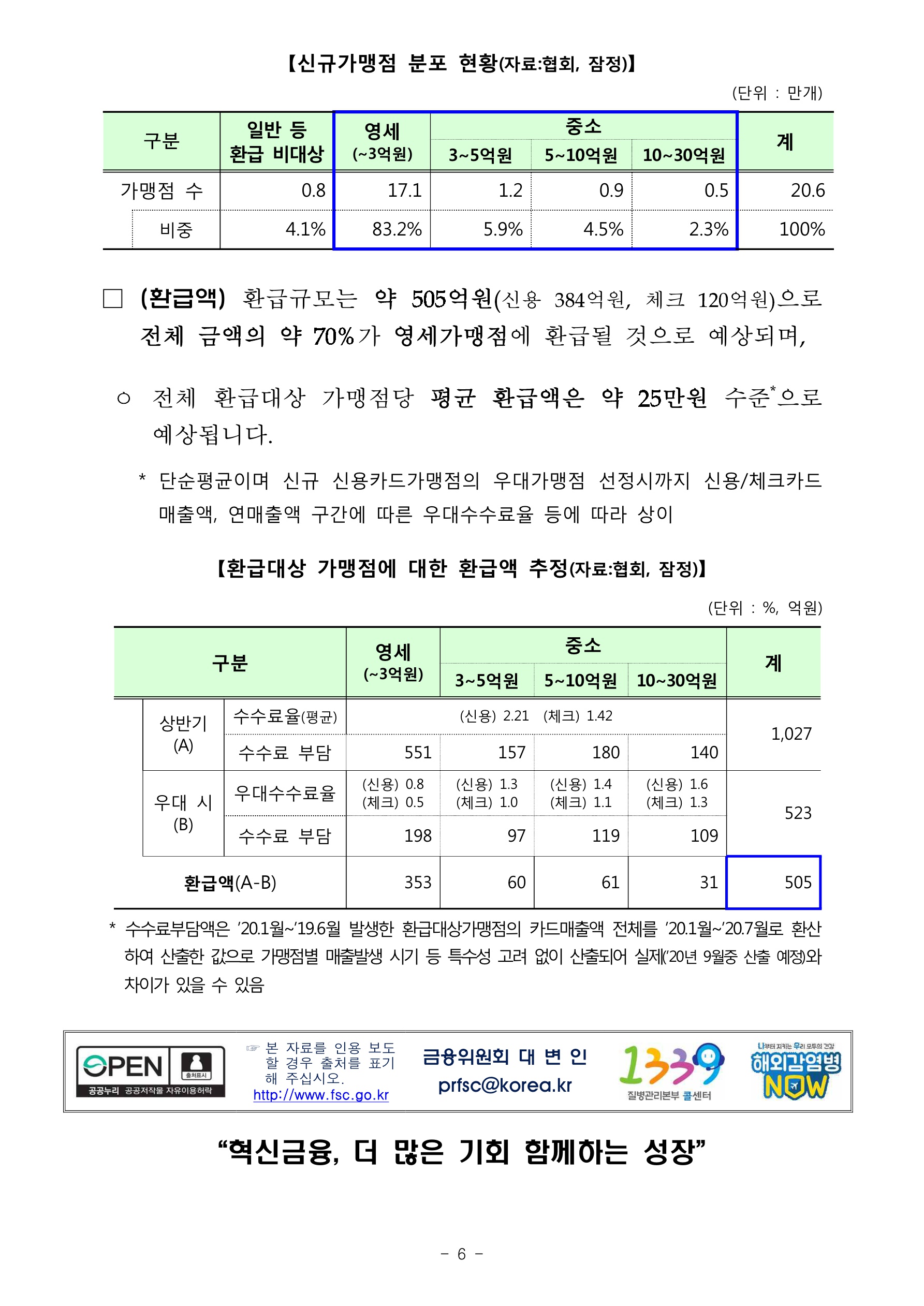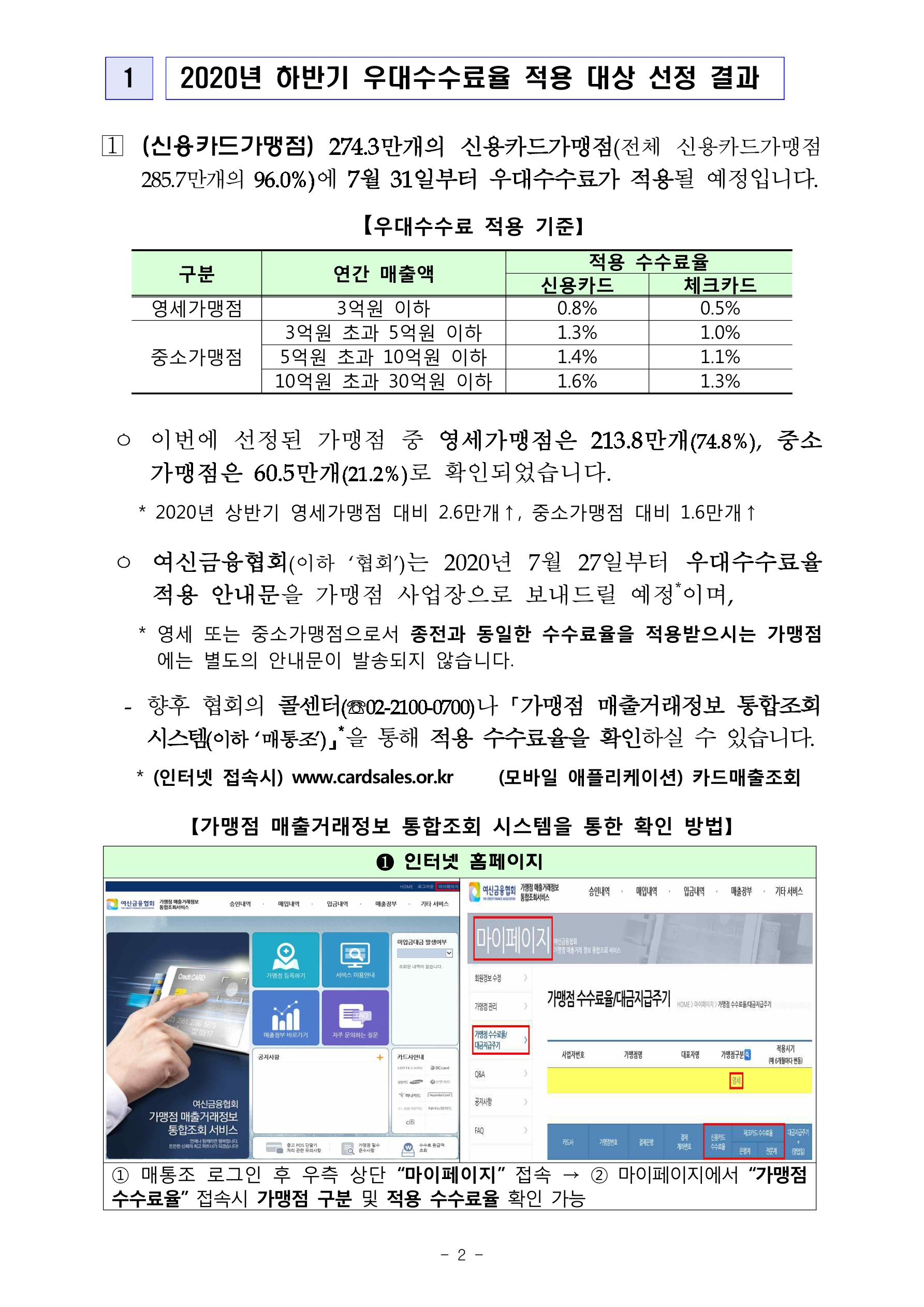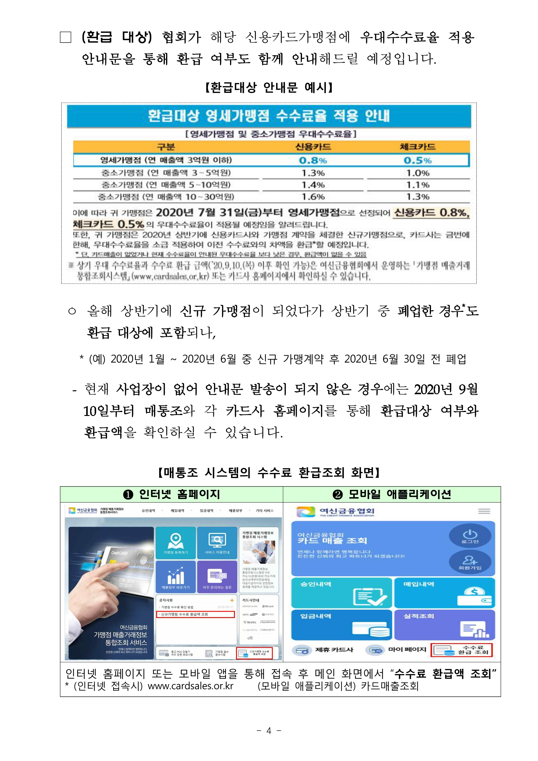 아래 자료의 출처는 금융위원회와 금융감독원입니다. 해당 출처의 자료임을 밝히면서 내용을 시작합니다. 자료의 제목은 2020년 하반기 영세. 중소신용카드가맹점 선정 결과 및 2020년 상반기 신규 신용카드가맹점에 대한 수수료 환급 안내에 대한 내용입니다. 아래 내용으로 시작합니다.