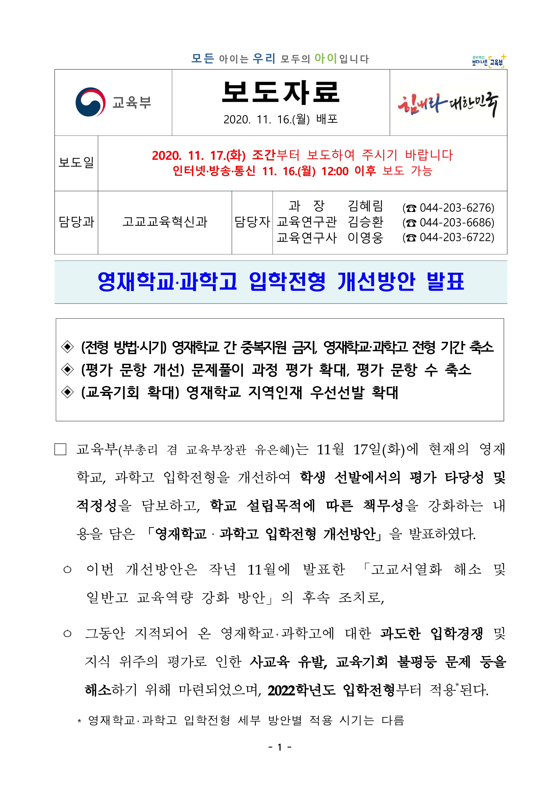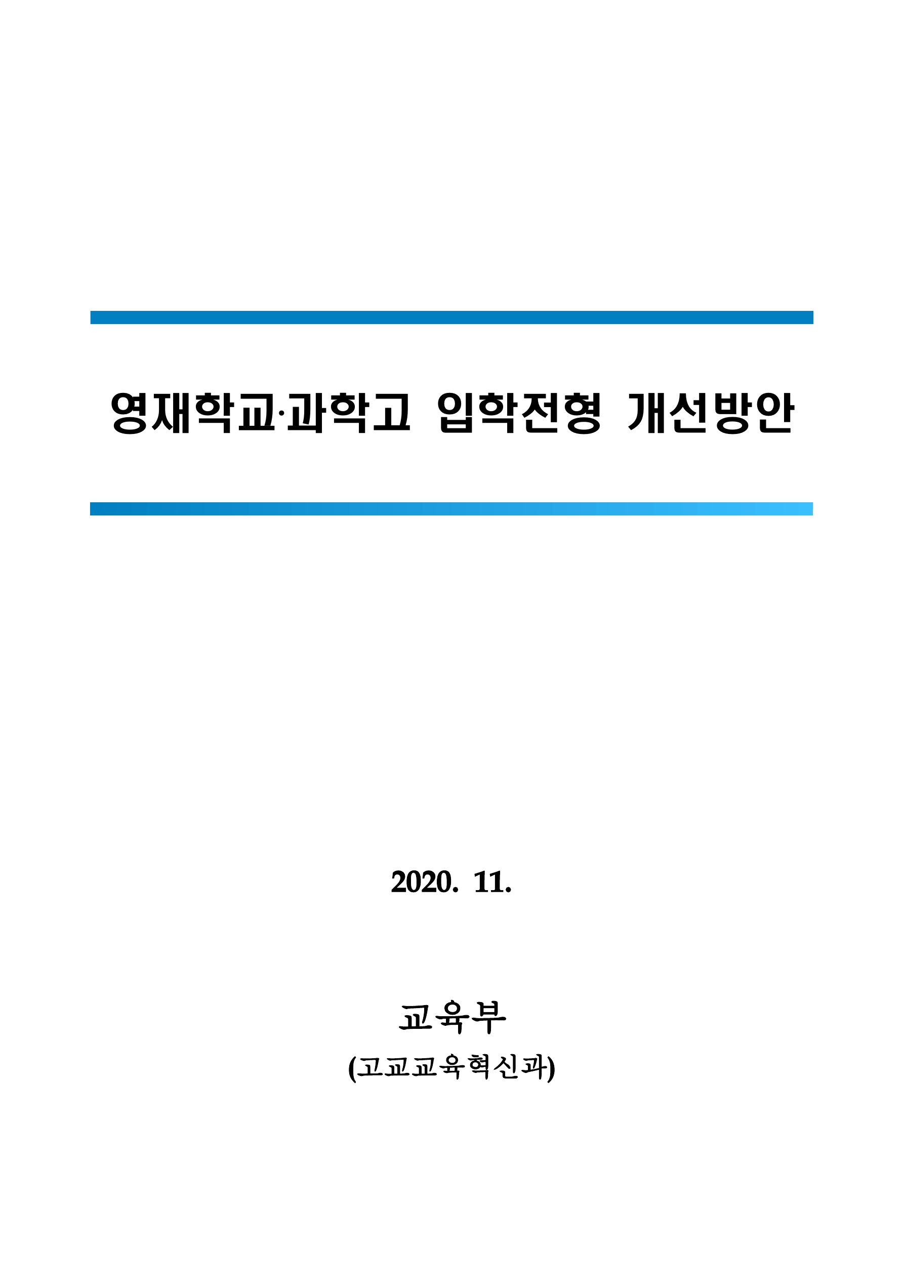 아래 내용은 교육부에서 최근에 보도자료로 낸 내용입니다. 해당 자료의 출처는 교육부입니다. 해당 출처임을 밝히면서 내용을 시작하겠습니다. 내용은 특목고, 영재학교, 과학고 등 입학전형 개선방안을 발표한다는 내용입니다. 어떤 내용이 변경되는지 잘 보셔야겠습니다.