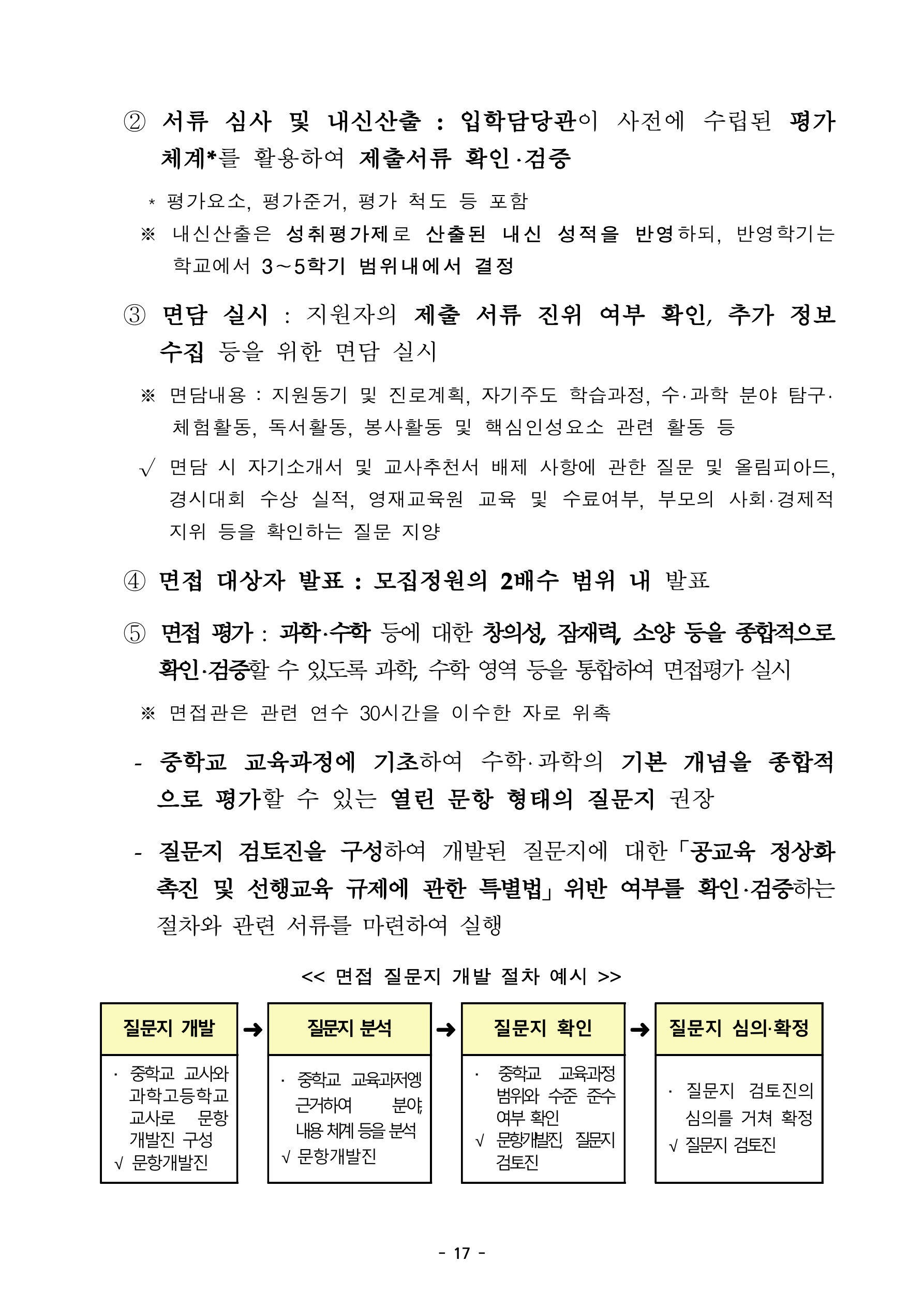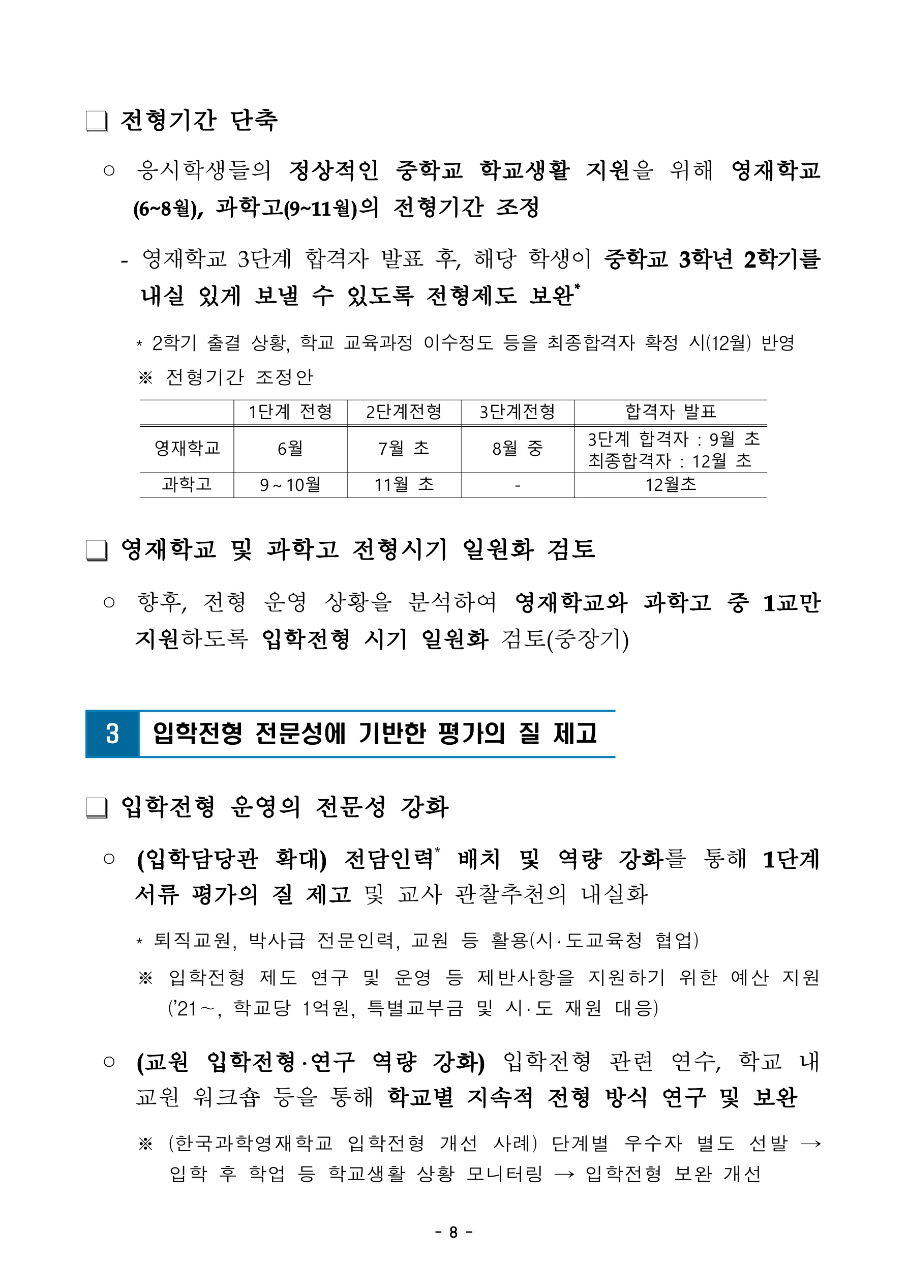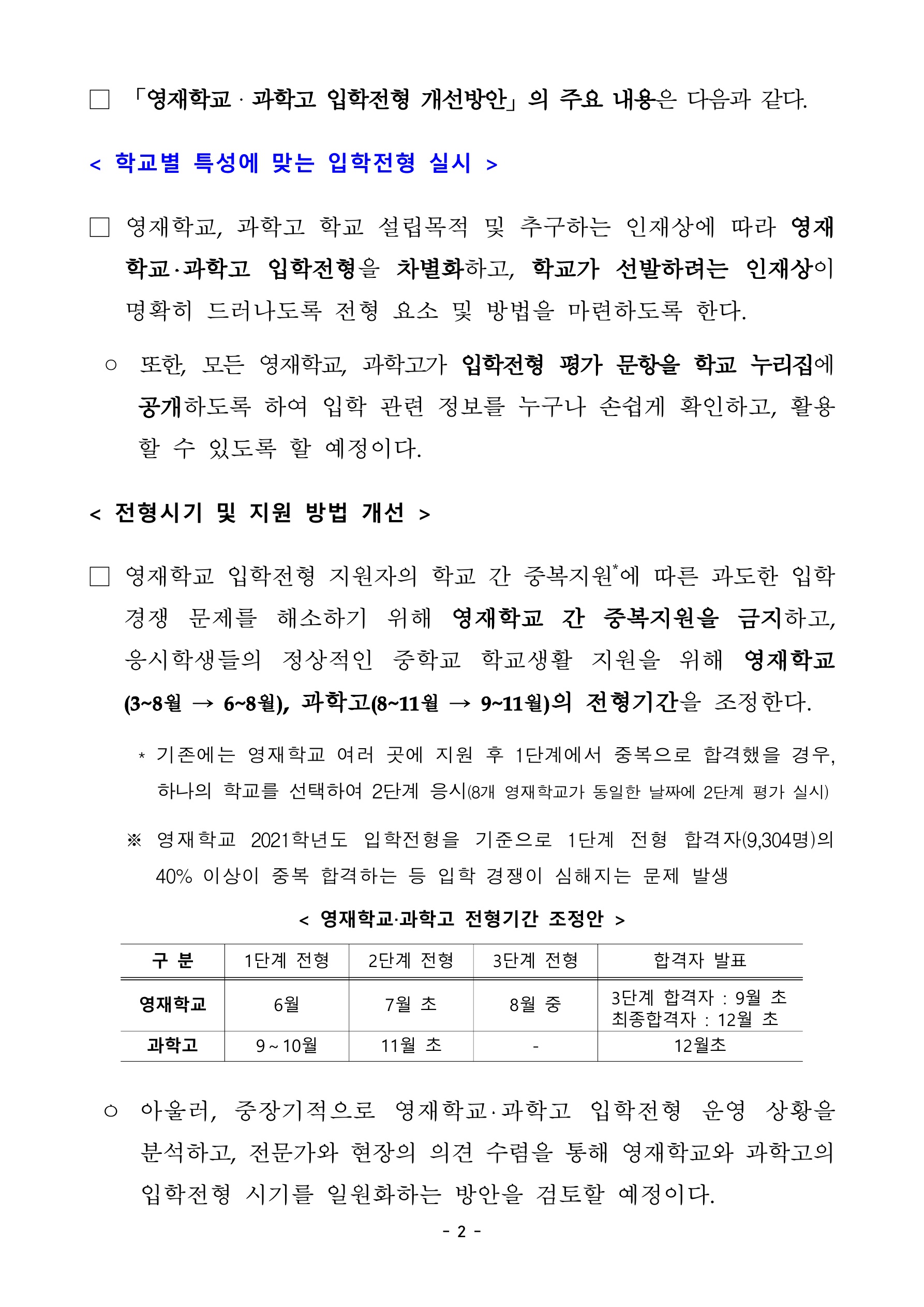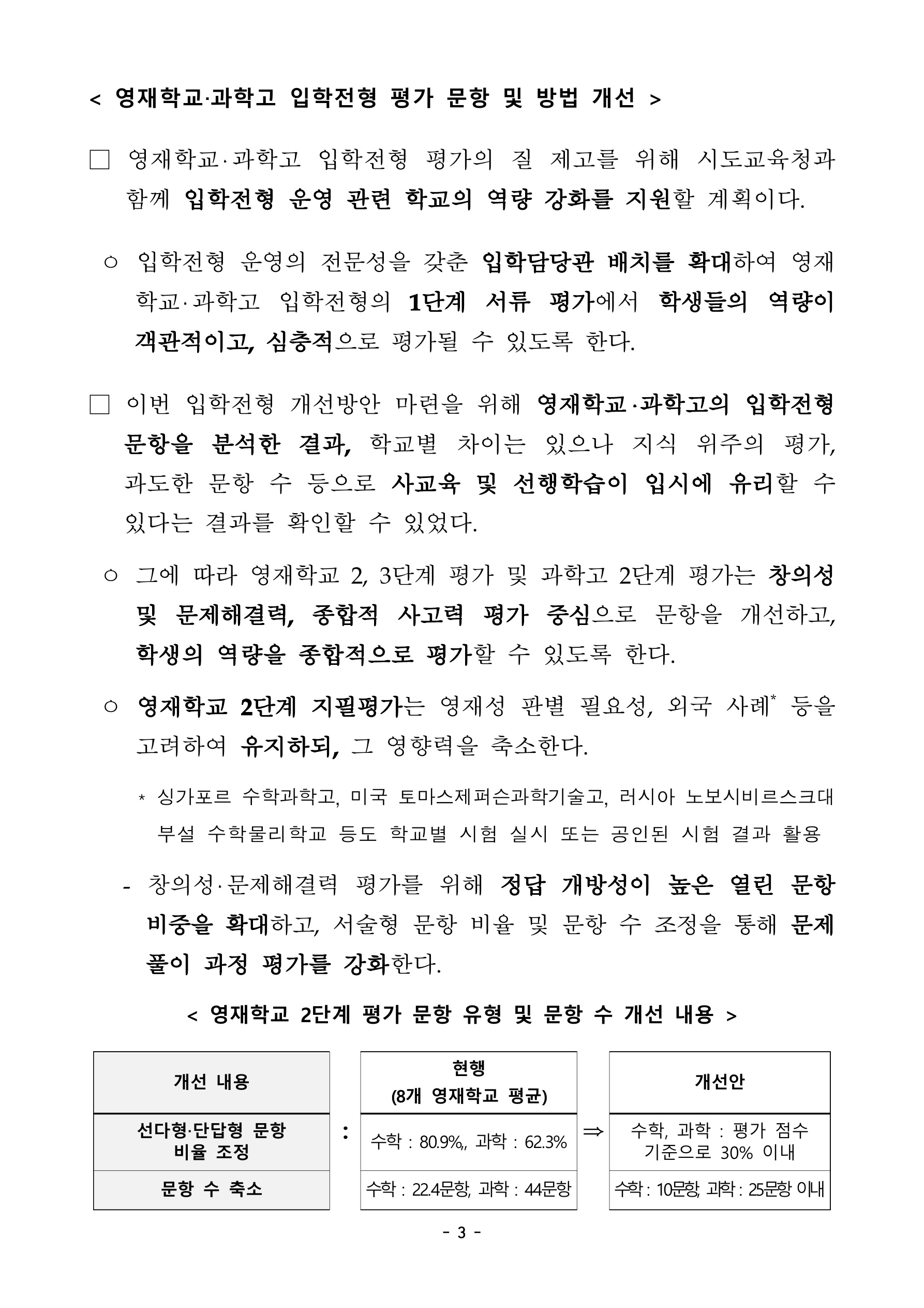 아래는 영재학교, 과학고 입학전형 평가 문항 및 방법 개선의 내용입니다.