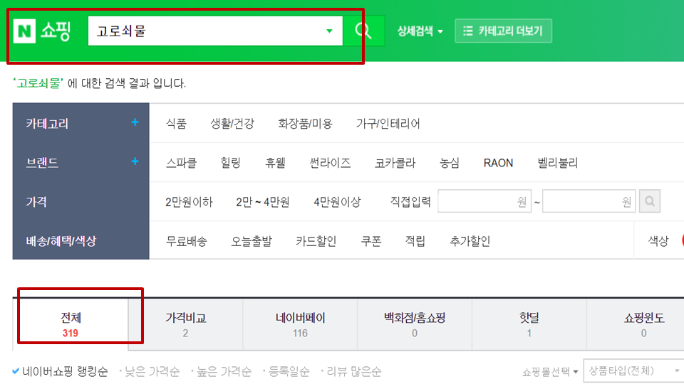 그리고 입점 건수도 체크해보았습니다. 입점 건수는 네이버 쇼핑에 해당 키워드로 검색 시 나오는 결과를 입력한 것인데요, 표는 아래 보시는 바와 같습니다.