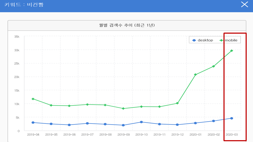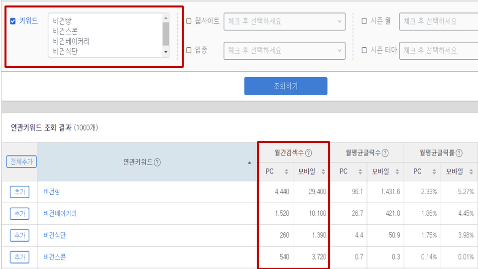 비건빵, 비건스콘, 비건베이커리, 비건식단 등의 키워드 검색량을 살펴보았습니다.
