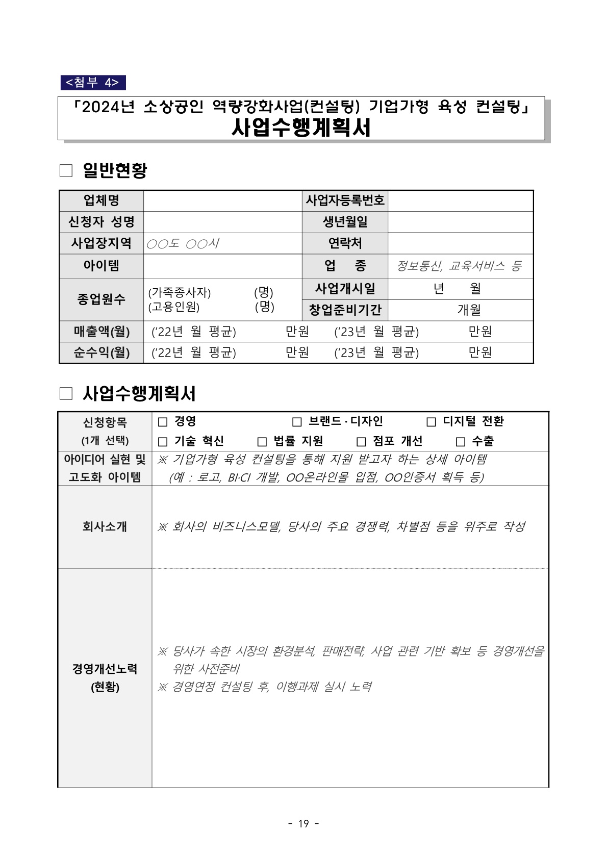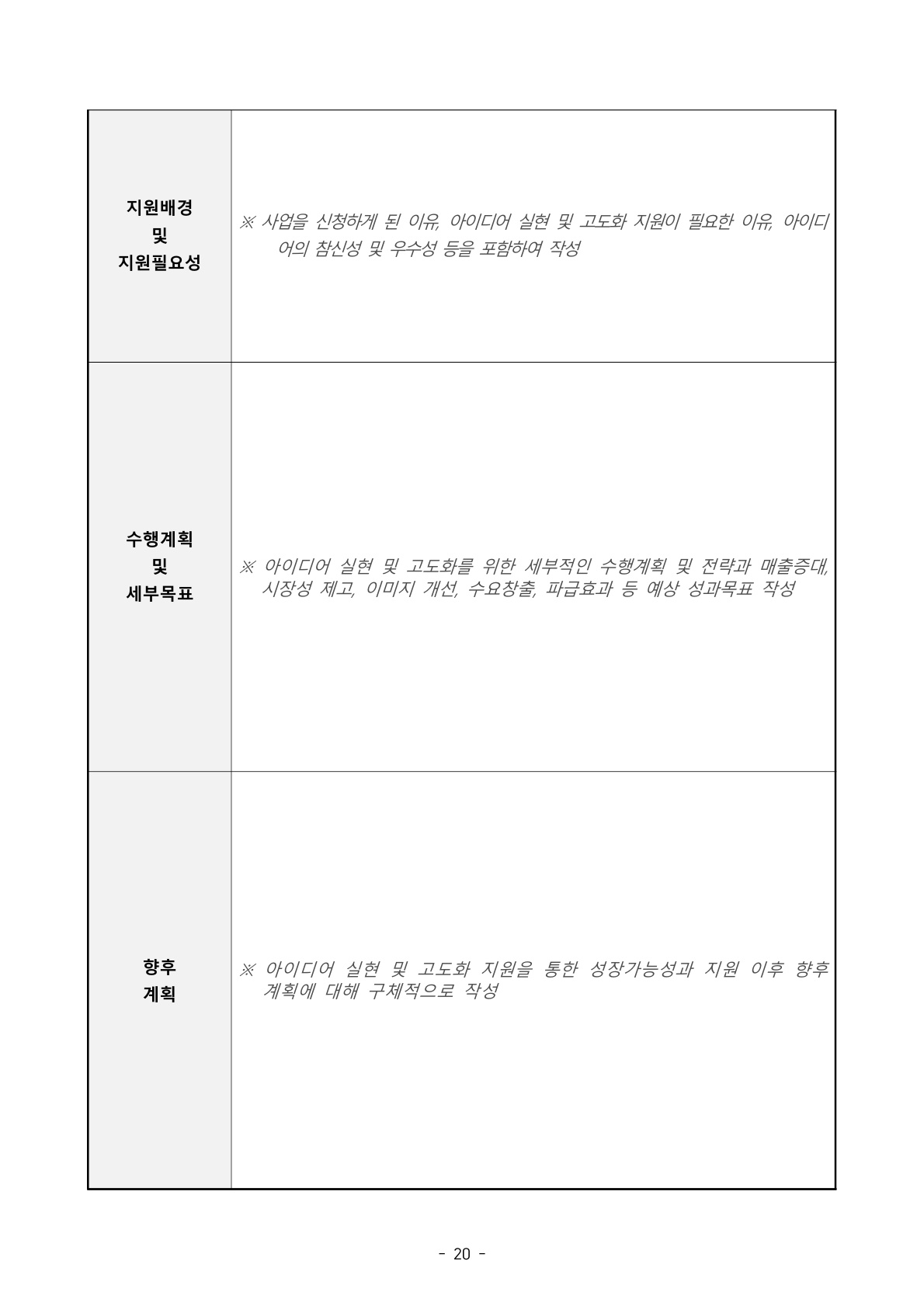 아래는 사업수행계획서 즉 사업신청서 (사업계획서) 작성 양식입니다. 내용이 많지 않으니 부담 갖지 마시고 접근하시길 제안드립니다.