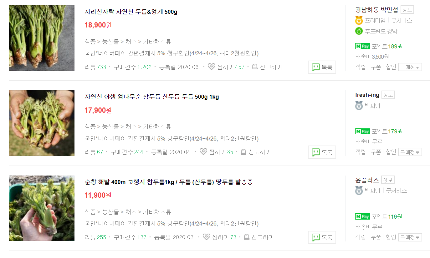 그리고 두릅이라는 것을 네이버 쇼핑에서 검색을 하면 4천 건이 안되는 입점수를 보이고 있습니다.