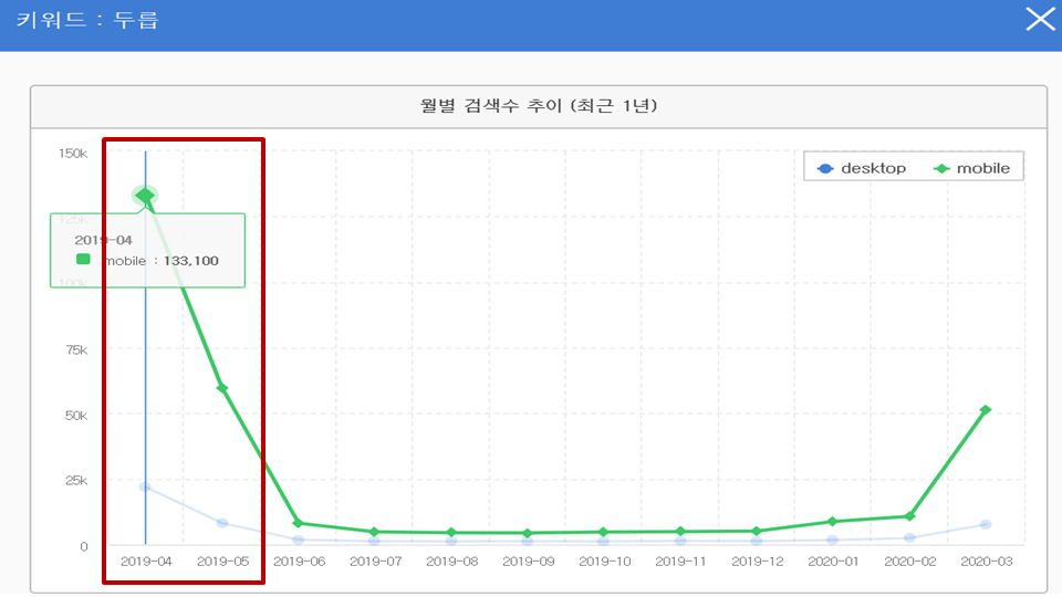 모바일에서 검색 된 전년도 4월달 기준으로 보면 10만 회 이상의 검색량을 보여주었고. 5월에도 5만 회 이상, 3월에도 만만하지 않습니다. PC가 아니라 모바일에서만 확인한 검색 트래픽입니다.