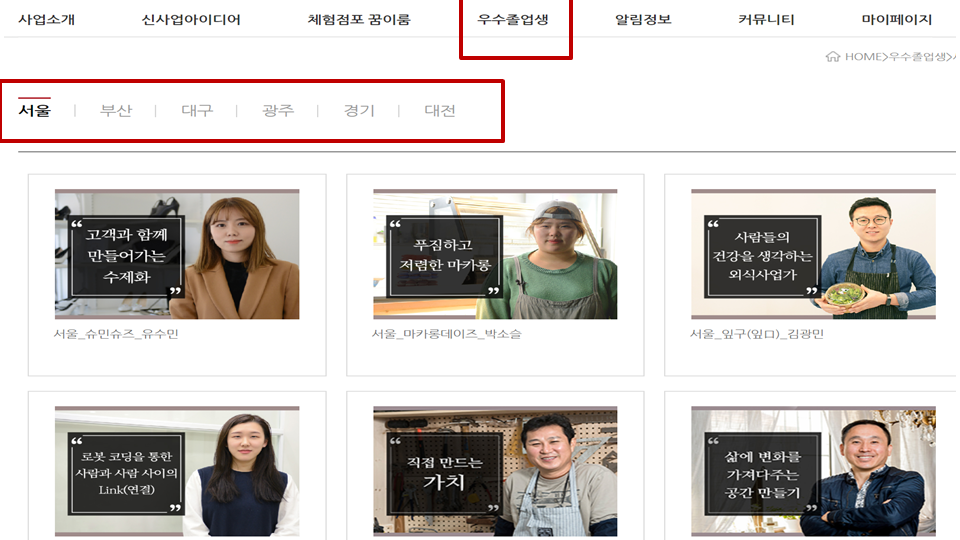 그리고 지역별로 우수 졸업생 관련 아이템 소개도 확인할 수 있습니다.