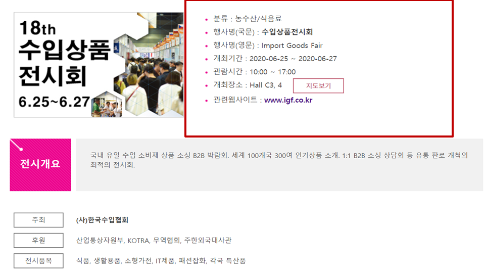 2020년 6월에 진행을 합니다. 해외로부터 들여온 다양한 수입상품을 접할 수 있습니다. 생활소품과 악세사리. 식품류 그리고 공예품 등 다양한 아이템을 한자리에서 접할 수 있으니 관심 가지면 좋을 거 같습니다.