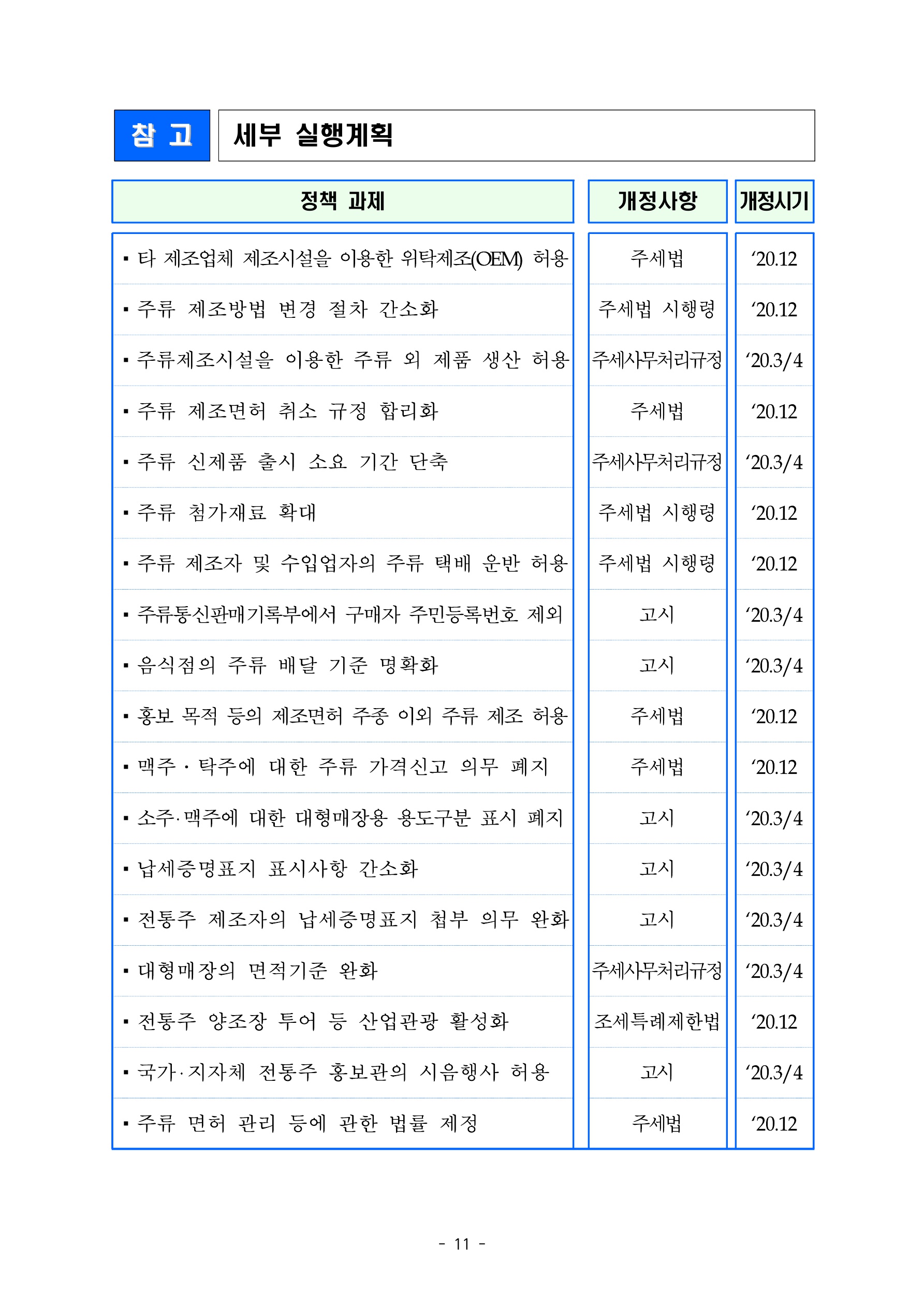 그리고 세부 실행계획에 대한 부분입니다. 개별 상세 정책 과제와 개정사항 그리고 개정 시기에 대한 내용입니다. 앞서 언급되었던 개별 정책과제에 대해서 개정 시기가 안내되어 있으니 신규 창업 또는 기존 관련 업종에 계시는 분들은 아래 시점을 잘 참고하셔서 선제적으로 대응한다고 하면 관련 다양한 비즈니스 전략이 도출될 것 같습니다.