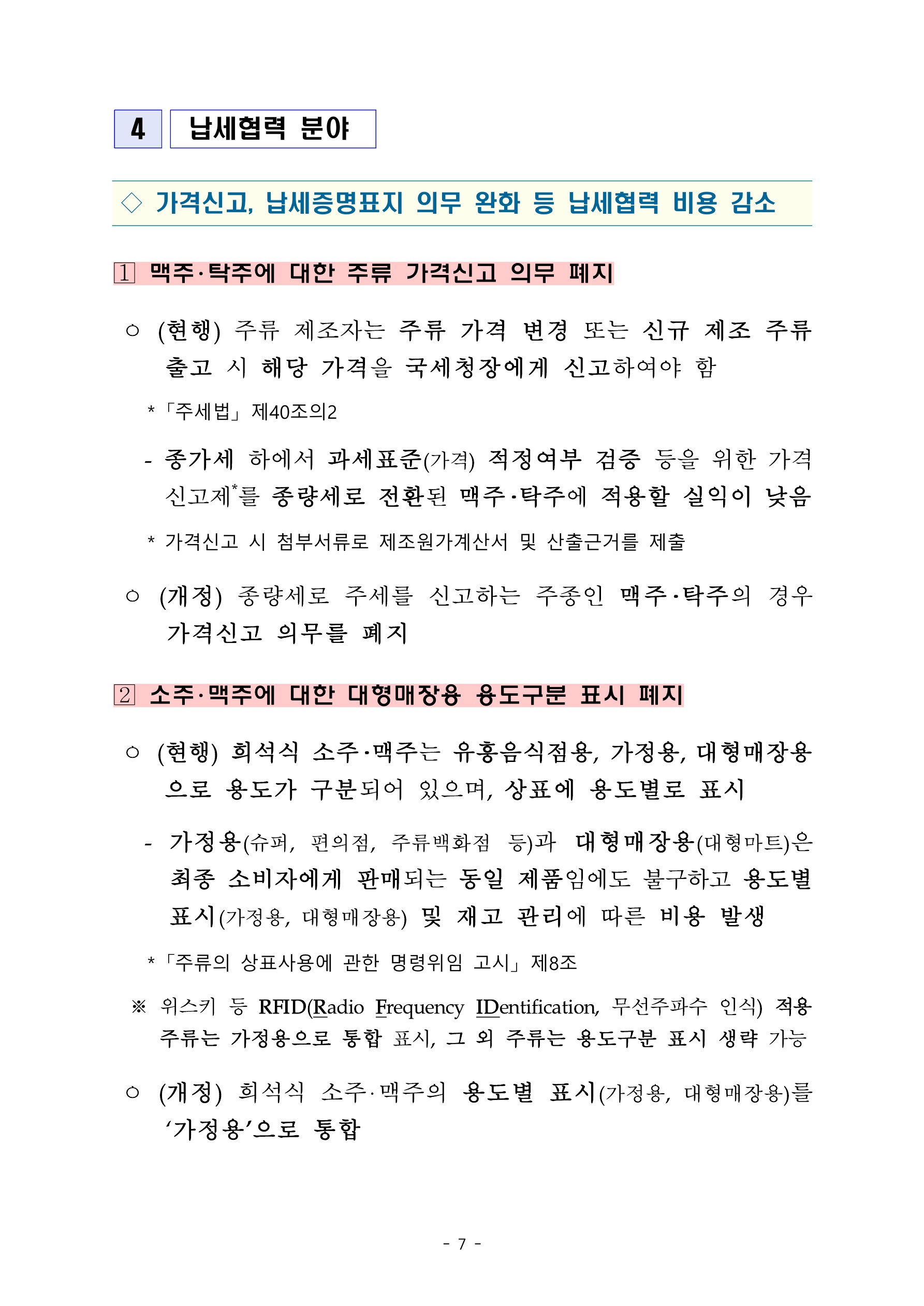 그리고 납세협력 분야에 대한 내용입니다. 우선 맥주 및 탁주에 대한 주류 가격신고 의무를 폐지한다고 합니다. 또한 소주 및 맥주에 대한 대형매장용 용도 구분 표시도 폐지된다고 하니 관련 비즈니스 생태계에 계시는 분들은 이 부분을 잘 참고하시면 좋겠습니다.
