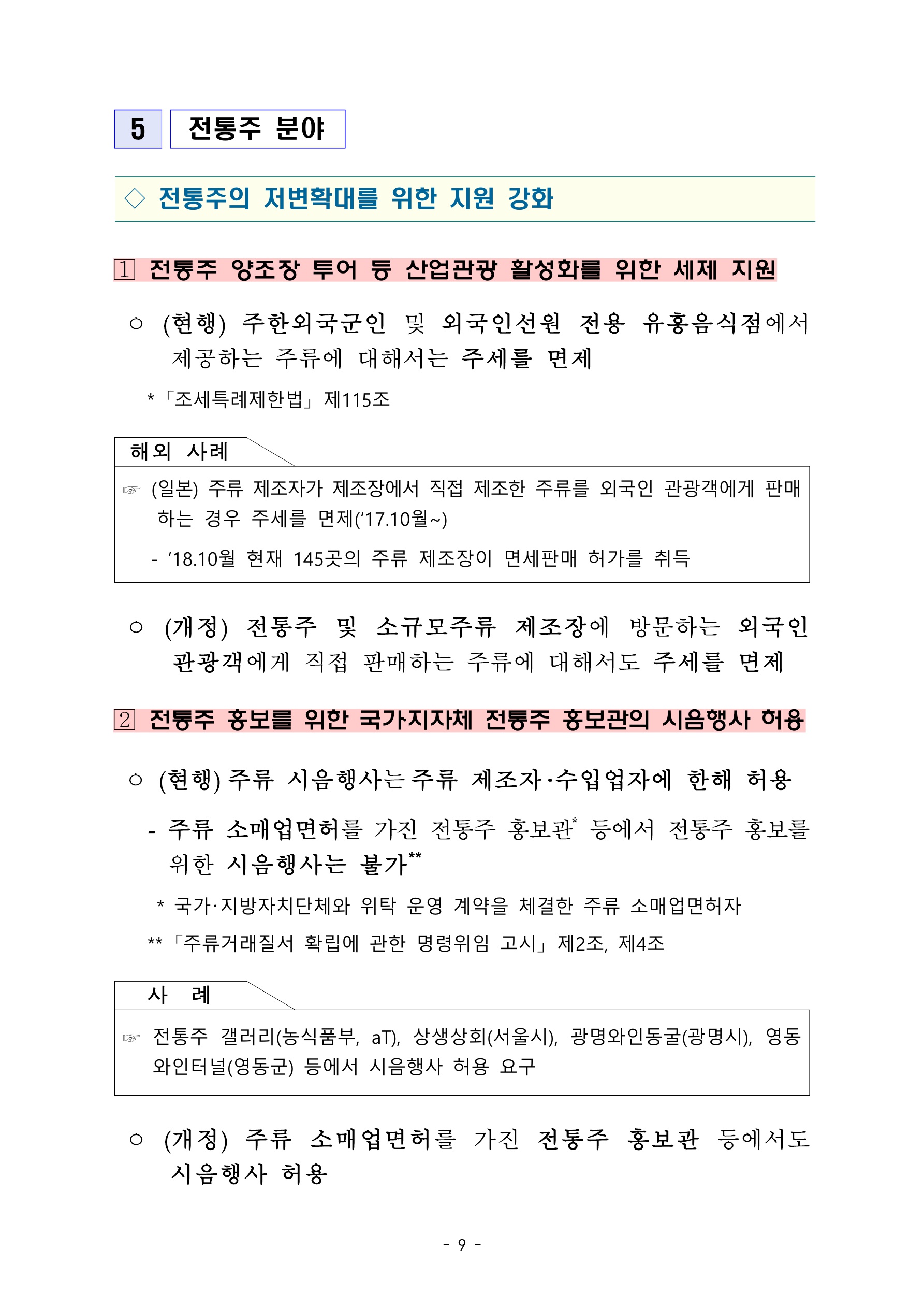 그리고 전통주 분야입니다. 전통주 양조장 투어 등 산업관광 활성화를 위한 세제 지원을 한다고 하니 관련 업종에 계시거나 신규로 창업을 하시려는 분들은 참고하시면 좋은 전략이 나올 것 같습니다. 그리고 전통주 홍보를 위한 국가 및 지자체 전통주 홍보관의 시음행사를 허용한다고 합니다.