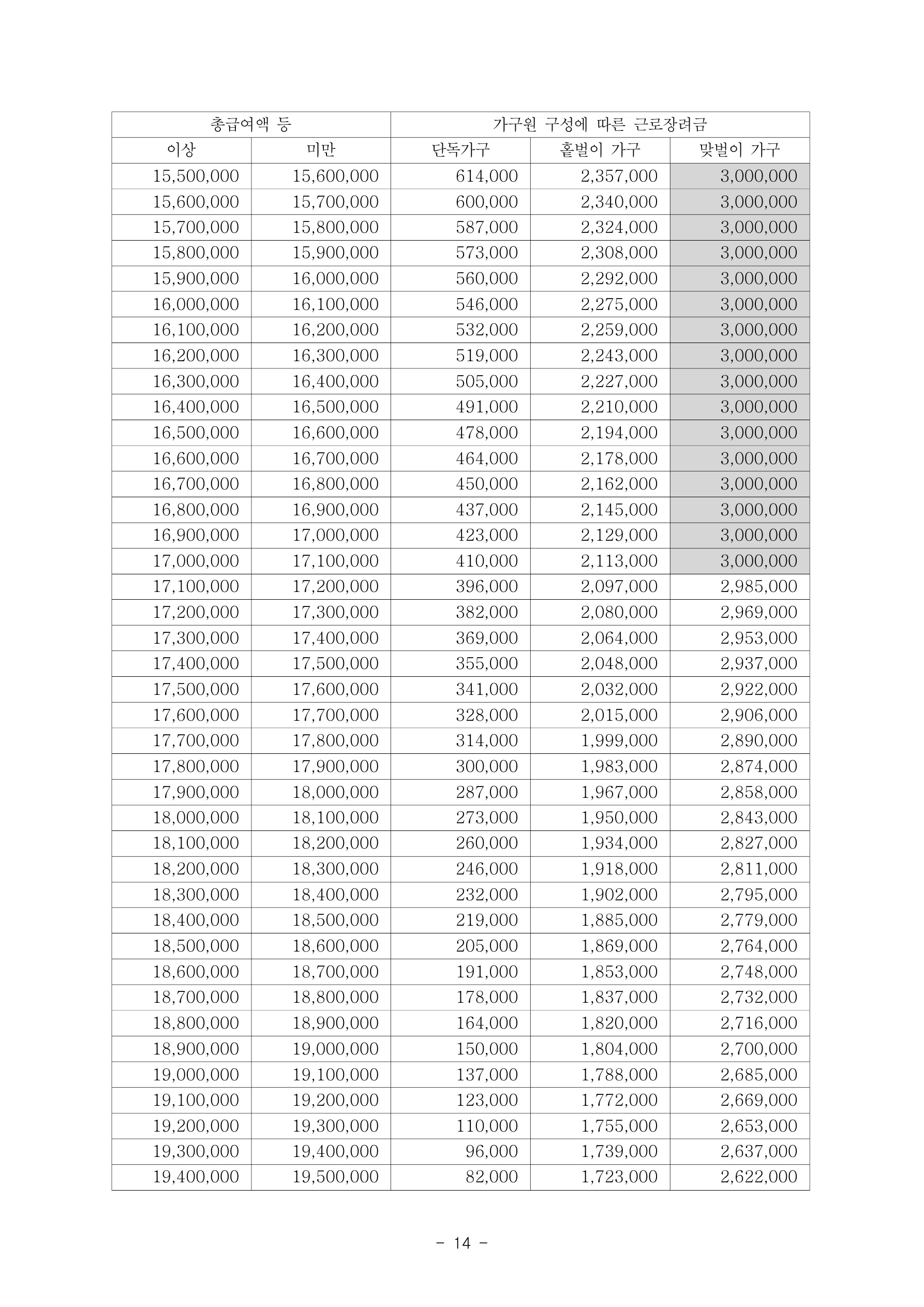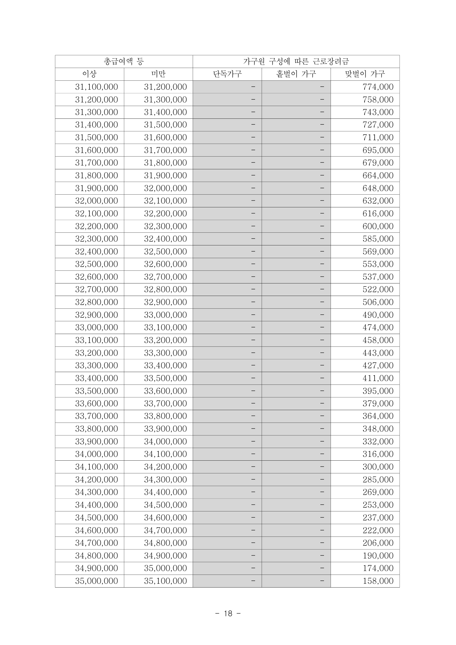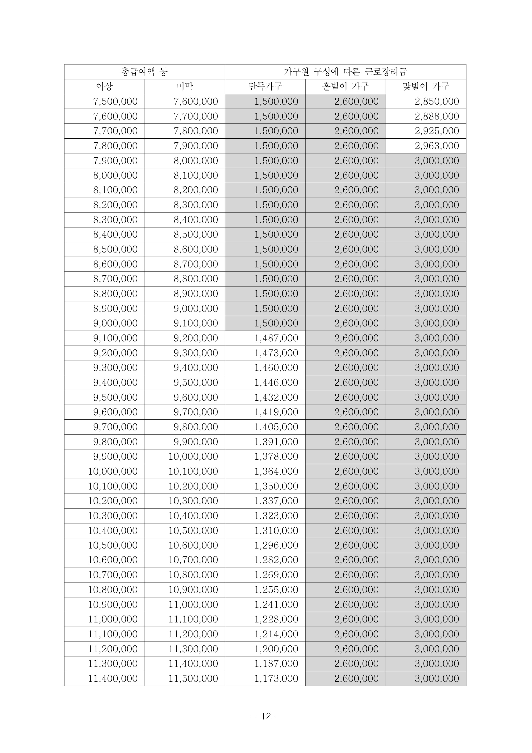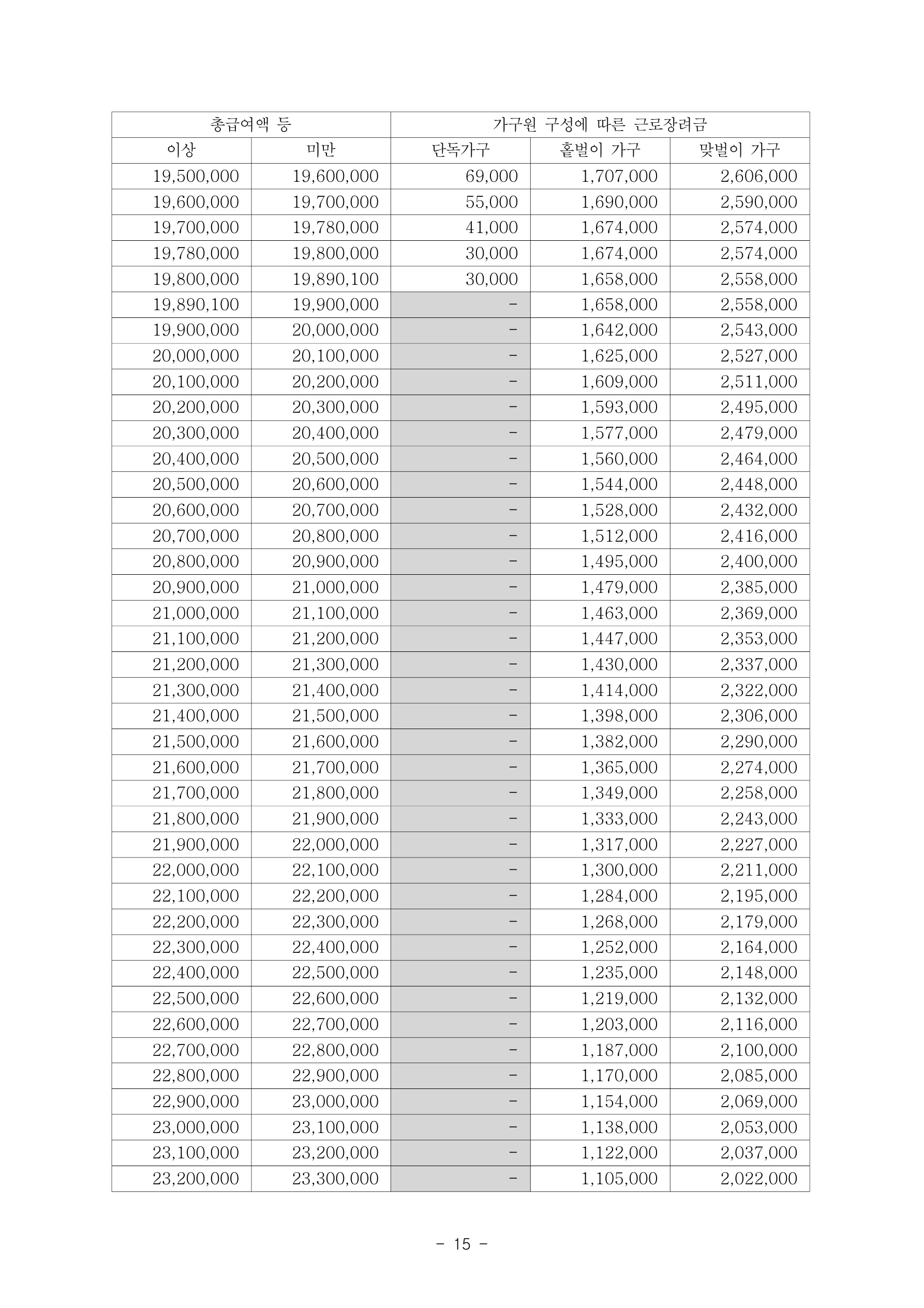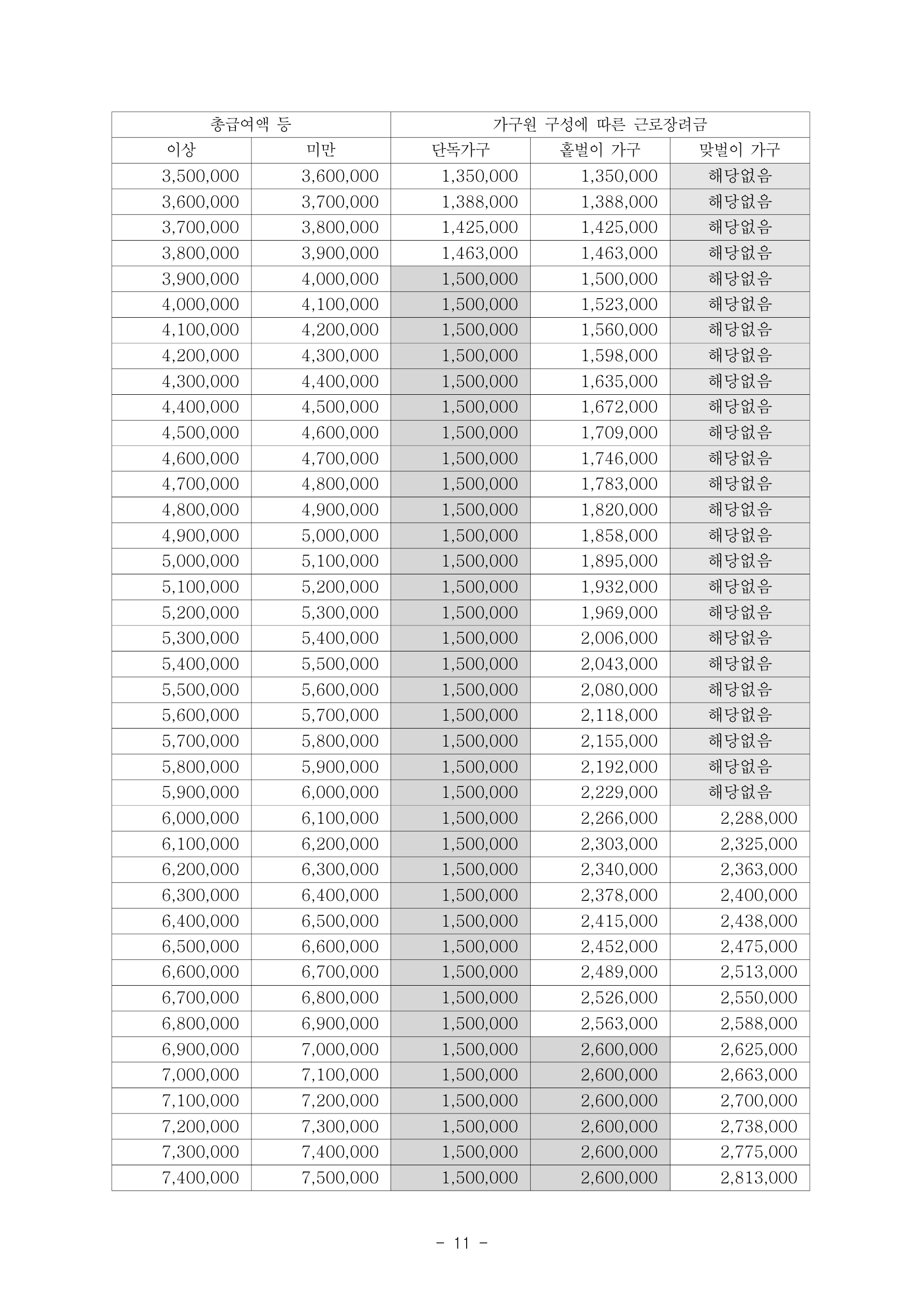 그리고 근로장려금 및 자녀장려금 산정표입니다. 이는 조세특례제한법 시행령 [별표 11]에 준하는 내용입니다. 산정표 기준으로 보시죠.